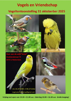 Vogelvereniging Vogels en Vriendschap is gevestigd in Rotterdam en is een sportieve club van vogelliefhebbers. Vogels en Vriendschap is opgericht in 1963, maar door een fusie met KVV in 2009 van naam veranderd. 10 Jaar later is door een aantal leden de draad weer opgepakt met de oude naam Vogels en Vriendschap. Met een nieuwe visie, nieuwe statuten, huishoudelijke regelementen en een open karakter gaan ongeveer de helft van de leden door onder de nieuwe (oude) Vogels en Vriendschap naam, ook wel VenV genoemd vroeger. Vogels en Vrienchap houdt zich bezig met het organiseren van clubavonden, beurzen, shows en tentoonstellingen proberen we het kweken en het het houden van vogels te bevorderen. In onze vogelvereniging vindt u kwekers van diverse soorten vogels, kanaries, topen, kromsnavels en Europese vogels.Wij begroeten u graag als lid!. Of u nu een ervaren kweker bent of pas begonnen bent met de vogelsport! Het bestuur en een aantal ervaren leden staan voor u klaar!